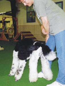 Teaching a dog to respond when various body parts are touched/cued is part of foundation training -- the same type of foundation training that teaching the alphabet is to a child. You can teach a child to speak by teaching individual words, but the child has a much better education if you teach it the alphabet and how to form words from the letters. Similarly, if we teach a dog his body parts, we can teach him to form new behaviors when we indicate the part of his body that will be used to form a behavior. Body targeting was probably first used as a maintenance tool by exotic animal trainers/keepers who taught their animals to present and hold steady a body part so that blood and urine samples could be drawn, feet and mouth health checked, and various parts of the body worked on. A few people in the dog training community saw these techniques and thought they might be useful in their own training programs . . . not only for health management but for training other types of behaviors. I first saw body targeting as a dog training tool at a seminar in 2003 when I met Sassie Joiris, a professional dog trainer from New York City. Besides competing in several dog sports, Sassie also trains her dogs for movie and commercial work. Her Norfolk Terrier Stamp has appeared in numerous movies, TV shows, and commercials and has titles in several dog sports. Sassie uses a number of techniques to train her dogs . . . body targeting is one of these. Stamp has been trained with bridges (an intermediate bridge and a terminal bridge) and targets from the time Sassie acquired him as a puppy and is fluent in responding to body targets. In media work, the dog has to be able to take cues from a distance. Sometimes a director will have to change a shot that the trainer has prepared the dog for. Using body target cues, Sassie can often verbally tell her dog (as the shoot is in progress) to isolate and move a particular body part in a direction other than where he had originally been trained to put it. 1) Have the dog in an informal Stand/Stay. (I started by kneeling by my dog's side.) 2) Using the pointer and index fingers together, gently push the dog's hip until you feel him "give" under the pressure -- while saying "Hip."