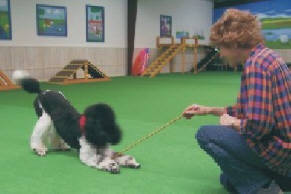 HEAD DOWN -- drop head down -- whether standing, sitting, or lying down (taught by first asking the dog to target my hand -- held progressively lower; also into his chest to bend the dog's neck and GO -- towards location indicated (initially taught by teaching the dog to target his front feet/foot to a "mark" (a small mat), clicking/treating each time he touches it with his foot, then progressively having him "Go Mark" from greater distances -- clicking/treating when he reaches target. GET IN -- get into what I indicate (taught by putting a treat inside the object (box, tub, etc.) and clicking when the dog goes inside to get it (clicking as the dog reaches the treat). This progresses to cueing "Down" when the dog is comfortably getting inside the object. GO THROUGH -- go through what I indicate (taught by starting out with easy obstacles and progressing to more difficult ones. I usually teach this with toys and play.) COME -- DOWN -- SIT -- WAIT -- standard obedience cues. NOSE -- target object/location with nose (In this clip, Jyah is targeting his nose to a large yellow ball. For directional pushes, I c/t pushes that moved the ball in the direction I wanted. (To begin teaching this, I put a treat under the ball so the dog has to put his nose under the ball to reach the treat, which rolls the ball. I click exactly as he reaches the treat.)