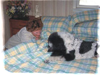 Think of the people you most like to be around - usually they're the ones with whom you engage in pleasurable activities, the ones who make you laugh and feel good about yourself. It's no different for your Poodle: these are also the type of individuals he likes to be around. FIRST, SOME GROUND RULES BE ENTHUSIASTIC -- Enthusiasm is contagious. Be enthusiastic in whatever games you play with your dog. If he's not used to such energetic displays from you, it may take him awhile to trust that you are sincere. In fact, if he's never seen you this happily animated in connection with what he's doing, he may decide to run for cover! Be patient. Anything of value takes time to establish. BE SILLY -- The sillier you are, the more interesting your dog will find you. Sometimes when my Standard Poodle Sydney wants to play, she will suddenly appear in the doorway with a toy in her mouth and a sparkle in her eye. I look up, do one of those big double-takes you see from cartoon characters, jump up, and run stomping after her like Godzilla. I can almost feel the thrill slide through her tummy as she whirls and dashes away to escape "the monster." Often I'll walk by one of my dogs, catch their eye and spontaneously break into a little jig (I can't believe I'm telling you this!). Of course, if you are suddenly silly with an unsuspecting dog who has no prior history of silliness being reinforcing, he'll probably think you're completely nuts and hide under the bed! KEEP IT SIMPLE -- Games don't need to be complicated or lengthy for your dog to have fun. Numerous simple little games throughout the day will help keep your dog's mind stimulated. For instance, at any given time, I may set up a barrier in a doorway which my dogs have to jump over on their way between rooms; when I'm at the end of a paper towel roll, I'll playfully "attack" the dogs with it and then let them capture it to tear up; I'll walk by while they're dozing, give them a little noogie on top of the head, then run down the hall like the house is on fire.