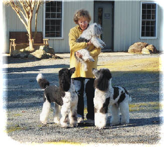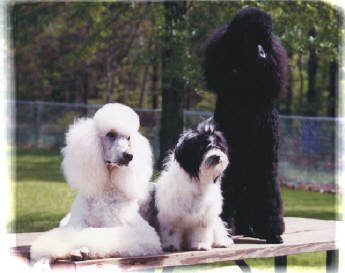 We found Molly wandering the streets of town in early 1990. She was a young adult with all her permanent teeth so she was at least six-months old. Advertisements did not bring her owners. At the time, we had two Standard Poodles: Stoney (black) and Keila (white), one and two years old respectively. April (apricot) came to live with us in 1991 when she was six-months old.