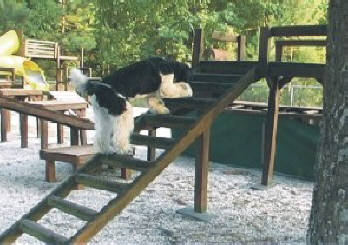 This massive piece of equipment consists of a hole "jump through" on one corner (see above left), three 3' square ascending platforms around front corner, a ramp off a tunnel on right side and a wavey slide off the back corner. Maze (left and above is a structure that has panels on opposite sides so the dog has to weave through (see apricot Poodle above). Left is one end where there is a board with a 4" rounded timber underneath to make it flip/flop when the dogs cross it. The "Tree House" sits underneath an oak tree and is the dogs favorite observation point.