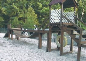 Click on paw to see This 8-foot sway bridge connects two towers in the above structure. Above is a junction area - left leads up to the tallest tower (slide comes off opposite side and ladder goes up to far side, maze is on near side. In closest (left) corner of the (right) picture, a short ramp leads up to the top of the maze where there is a catwalk over the top.