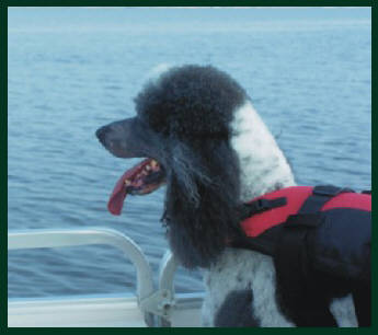 My husband Glenn and I were born and raised in the desert southwest at a time and in a place where the only bodies of water were man-made reservoirs and cattle watering tanks. We currently live in the southeastern U.S., ten minutes driving time from a large lake where we regularly take the dogs to swim and play. But, as often in our lives as we've been near or in water, neither of us has ever floated in a vessel over a large, deep body of it. So, it was with some trepidation that we decided to acquire a boat. Nothing speedy - just something to putter about the lake in, something flat that the dogs could walk around on while we bobbed along, something slow, very slow . . . something like a pontoon boat. But first, to see if we and our two Standard Poodles Jyah and Sydney were truly cut out to be sailors, we drove to a boat rental place and asked to rent a pontoon. As soon as we told the proprietor we would be taking our dogs on board, he said, “No dogs!!” “Why?” “Dog dander.” “Dog dander??” Reasoning with him about the hypoallergenic nature of Poodles was unsuccessful so we and the dogs left. We located a private owner who had a four-year-old, 18-foot pontoon boat - a seemingly manageable size for novices. It was a cloudy day, and the boat was parked under a massive oak tree . . . which is why we didn't notice the large amount of yellow Lab hair woven into the blue carpet until we got the boat home. (Now I know why boat rental places are unwilling to allow dogs on board!) For the next couple of weeks, we cleaned, vacuumed, re-vacuumed, and thoroughly checked out the boat. Then we could no longer put off the inevitable . . . we either had to launch the boat or admit that we now had a very large yard decoration. It was mid-June when we loaded the Poodles into the pickup, hooked up the pontoon trailer, and headed off to the lake. When instructing us on how to launch the boat, the previous owner said, “Back the trailer down the boat ramp into the lake and, as soon as the propeller is under water, start the engine and back the boat off the trailer.” Well, first let me tell you that backing a pickup truck attached to a trailer is not as easy as it sounds; however, we finally got the trailer backed down the launching ramp into the lake to where the boat's propeller was under water. Glenn said, "Get in the boat, turn the ignition on, and back the boat off the trailer." I got in the boat, turned the key, kicking the motor into action, and put the gear shift in reverse. The boat heaved and bucked . . . and stayed firmly on the trailer. (Now that I think back, that's probably a good thing since I had no idea how to drive the boat. I can see myself floating helplessly off while my Poodles' dear little worried faces got smaller and smaller in the distance.) Meanwhile, Jyah and Sydney, wearing their snazzy red life vests, paced back and forth on the dock, wondering what strange experience awaited them - and probably about their people's sanity. Glenn said, “Turn off the engine, take that rope and secure it to the rail of the pontoon, then throw it over to the dock and tie the boat up.” “Okay.” I cut the engine, tied the rope to the back rail of the boat, threw the other end onto the dock, jumped out, and tied the rope to a pier post - or, thought I had. Soon the rope was trailing in the water, and I had to wade out to retrieve it. I climbed back onto the dock and tied the end of the rope securely to one of those little hooks on the edge of the dock made for that purpose (funny, I hadn't noticed those before) and shouted to Glenn, “Okay, go!” He gunned the pickup engine, yanking the trailer out from under the pontoon. It lurched into the water and, as if heading for freedom, floated out to “sea” . . . until it reached the end of its rope. Meanwhile, Jyah and Sydney had retreated further up the ramp, both with very perplexed expressions. They must've thought their people looked like cartoon characters scurrying around with everything going wrong that could go wrong. We finally got the boat pulled back in and secured to the side of the dock. Glenn parked the pickup and trailer, and we and the Poodles climbed aboard the boat. Jyah and Sydney are used to riding in the bed of our little Kawasaki Mule (a sort of miniature pickup) over bumpy woodland roads so the slight rocking movement of the boat caused them little concern. We sat there for a moment gathering our courage. Then Glenn reached down and turned the ignition key. Nothing happened. Finally, after several sputtering false starts, the motor caught and the propeller began whirling. We untied the boat, and it immediately began floating out toward open water. It was then that the thought struck us. “What if the engine dies while we're out in the middle of the lake and we can't get it started?” Jyah and Sydney also seemed to share these concerns as they both kept looking over the rail apprehensively at the murky liquid surrounding the boat. We decided to stay close to shore as no one else was out boating and, if we got into trouble, we were on our own. I suppose we thought we could swim to shore if the engine died; however, since it was a good 400 feet to shore, and since neither Glenn nor I have swum since our youth, and since Jyah and Sydney have only ever swum short distances, it may have been a false sense of security. The thought gave us comfort though, and we glided back and forth near the shore on glass-smooth water, in circles and in loops. Glenn captained the boat while the Poodles and I sat clumped together on the little sofa in the middle of the deck; however, it wasn't long before Jyah was walking around looking over the railing into the water . . . probably assessing his chances of reaching solid ground. Sydney stayed on the sofa, the highest place she could get above water, seemingly more confident in her crew's abilities than was Jyah. Within the hour, Glenn and I began getting antsy as our minds wer